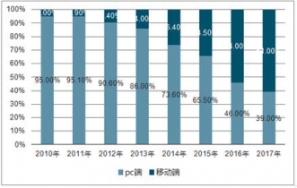 2010-2019年中國(guó)廣告主互聯(lián)網(wǎng)PC端與移動(dòng)端媒體投放費(fèi)用預(yù)算分配比例