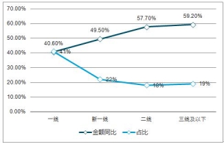 年輕人口回流、較快的中產(chǎn)化與較低的負(fù)債率等因素促成了二三線城市的消費(fèi)升級(jí)。各線城市消費(fèi)支出增速出現(xiàn)分化,其中二、三線城市消費(fèi)支出金額增速高達(dá)57.7%、 59.2%,高于一線城市。