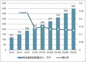 中國高凈值家庭數量及增長率(萬戶,%)