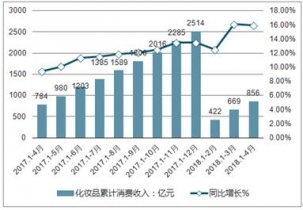 2019年4月份化妝品消費(fèi)收入196億元,與去年同期增長(zhǎng)15.1%。2019年1-4月中國(guó)化妝品累計(jì)消費(fèi)收入達(dá)856億元,同比增加15.9%