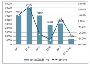 2019年1-4月中國出口豬肉13556噸,同比下滑23.5%;縱觀近五年中國豬肉出口數量情況,年均復合增長率為-8.57%。