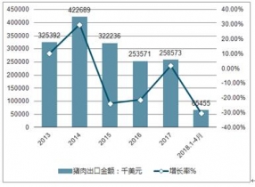 2019年1-4月中國豬肉出口金額為6545.5萬美元,同比下滑30.2%;縱觀近五年中國豬肉出口金額情況,年均復合增長率為-5.58%。