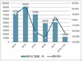 2019年1-4月中國出口豬肉13556噸,同比下滑23.5%;縱觀近五年中國豬肉出口數(shù)量情況,年均復合增長率為-8.57%。