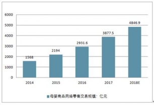近幾年,中國母嬰商品網(wǎng)絡(luò)零售交易規(guī)模不斷擴(kuò)大,2014年母嬰商品網(wǎng)絡(luò)零售額僅1568億元,2015年突破2000億,達(dá)到2194億元,2016年逼近3000億元,達(dá)到2931.6億元。2019年進(jìn)一步增長(zhǎng),母嬰商品網(wǎng)絡(luò)零售總額387.5億元,同比增長(zhǎng)32.3%。近幾年,中國母嬰商品網(wǎng)絡(luò)零售額增速呈現(xiàn)下降的趨勢(shì)。預(yù)計(jì)2019年市場(chǎng)規(guī)模將達(dá)到4846.9億元。
