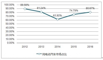 2012-2016年我國純電動汽車市場占比
