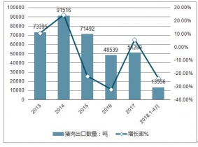 2019年1-4月中國出口豬肉13556噸,同比下滑23.5%;縱觀近五年中國豬肉出口數量情況,年均復合增長率為-8.57%。
