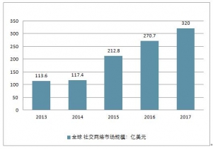 在高人群量的社交訪問及交流的促進下,全球社交網絡規模不斷增加。2013-2016年,全球社交網絡市場規模保持強勁增長,由2013年的113.6億美元達到2016年的270.7億美元,相比2015年增長27.21%。未來隨著社交人群的普及,全球社交網絡市場總規模將進一步增加,估算2019年,全球社交網絡規模將達320億美元。