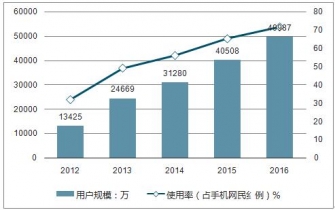 2012-2016年中國手機(jī)網(wǎng)絡(luò)視頻用戶規(guī)模及使用率走勢(shì)