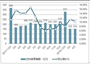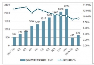 在飲料零售方面,2019年4月份飲料類零售總額達(dá)153億元,與去年同期增長(zhǎng)10.4%。2019年1-4月中國(guó)飲料類零售總額達(dá)636億元,與去年同期增長(zhǎng)9.4%