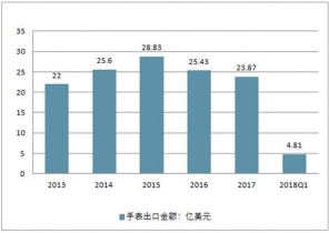 2013-2019年Q1中國手表行業出口金額及增長走勢分析
