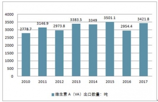 2017 年我國共出口 VA 3421.8 噸(備注: VA 出口 產(chǎn)品種類較多,有 VA100 萬 VA65 萬 VA50 萬等), 出口金額 1.69 億美元, 折合出口單價 49.4 美元/千克,但從當(dāng)月出口數(shù)據(jù)看,第四季度 VA 受 BASF 火災(zāi)事故影響,價格上漲明顯, 今年 1 月份出口單價突破 200 美元/kg,達(dá)到 201.8 美元歷史高位。 從 2010 年到 2017 年,年出口數(shù)量基本穩(wěn)定在 3000-3500 噸, 下游需求穩(wěn)定。