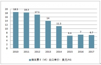 我國 VE 出口情況: 2017 年 VE 出口量 6.87 萬噸,占當(dāng)年我國 VE 總產(chǎn)能的 80%以上, 但從 2010 年以來,出口價格持續(xù)下滑,近 3 年維持 6.4-7.2 美元/kg 歷史低位。 自去年 11 月開始,受 BASF 德國工廠爆炸影響, VE 國內(nèi)市場報價和國際出口價格同步上揚,雙雙上漲約一倍,今年 1 月 VE 出口均價達(dá) 12.3 美元/kg 。