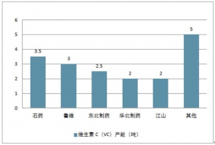 我國每年 VC 產能約為 20 萬噸, 但全球需求量只有 12-13 萬噸, 產能嚴重過剩。 VC 產能分布主要為“五大家族”,即石藥 3.5 萬噸,魯維制藥 3 萬噸,東北制藥 2.5 萬噸,華北制藥 2 萬噸,江山制藥 2 萬噸, CR5 約為 65%。還有天力,拓洋等多家企業生產,產能約為 5 萬噸。 產能地域分布上集中于河北、遼寧、山東等環京省份,占總產能的一半以上。