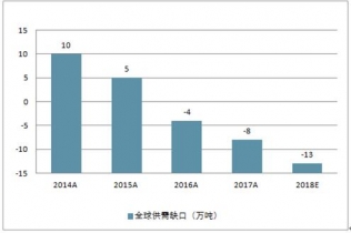 2014-2019年全球鎳供需缺口走勢(shì)