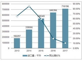 2013-2019年中國啤酒進口量及同比增長走勢
