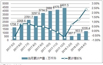 2017-2019年全國啤酒當月累計產(chǎn)量及增長走勢