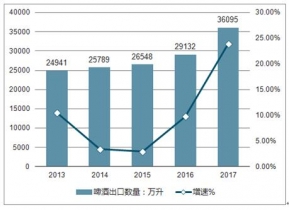 2013-2019年中國(guó)啤酒出口數(shù)量及同比增速走勢(shì)