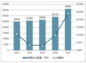 2013-2019年中國(guó)啤酒出口數(shù)量及同比增速走勢(shì)