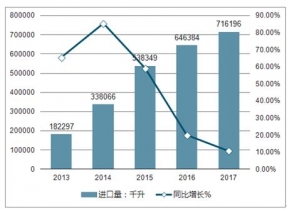 2013-2019年中國(guó)啤酒進(jìn)口量及同比增長(zhǎng)走勢(shì)