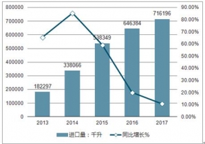 2013-2019年中國(guó)啤酒進(jìn)口量及同比增長(zhǎng)走勢(shì)