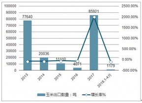 2013-2019年中國(guó)玉米出口數(shù)量及增長(zhǎng)走勢(shì)分析