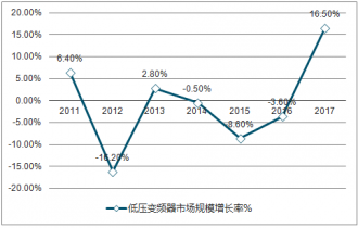 變頻器(Frequency Transformer)是一種把電壓與頻率固定不變的交流電,變換為電壓和頻率可變交流電的裝置,一般用于控制交流電機(jī)的轉(zhuǎn)速或者輸出轉(zhuǎn)矩。按照變頻器所配電機(jī)的電壓等級,變頻器市場細(xì)分為高壓和中低壓兩個部分。其中低壓變頻器用途最為廣泛,而過去幾年整體市場規(guī)模處于震蕩周期。 2017 年,隨著下游行業(yè)景氣度穩(wěn)步提升,低壓變頻器市場規(guī)模也大幅反彈。2017 年低壓變頻器規(guī)模約為 189.90 億元,同比增長約 16.5%。