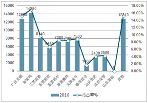 2016國(guó)內(nèi)主要電解液廠家產(chǎn)量及市占率(噸。%)
