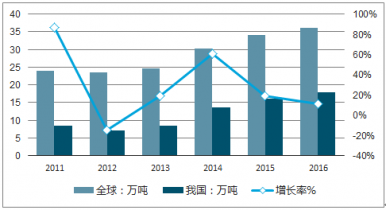 2011-2016年我國多晶硅產(chǎn)量、增長率及全球多晶硅產(chǎn)量勢