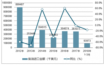 2019年1-3月中國(guó)柴油進(jìn)口數(shù)量為16萬(wàn)噸,同比下降31.4%;2019年1-3月中國(guó)柴油進(jìn)口金額為93973千美元,同比下降16.2%。