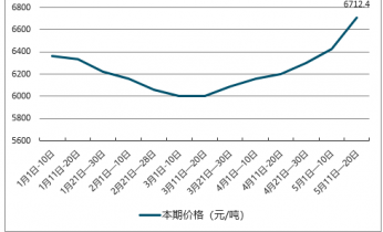 截止至2019年5月中旬,柴油價(jià)格為6712.4元/噸,環(huán)比5月上旬價(jià)格上漲281.9元/噸,漲幅為4.4%;柴油市場(chǎng)價(jià)格亦在此時(shí)達(dá)到目前為止本年度最高值。3月上旬,柴油價(jià)格呈現(xiàn)最低值,為6001.4元/噸,環(huán)比2月下旬下跌56.3元/噸,跌幅為0.9%。最高值與最低值相差711元/噸。