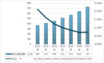 2011-2017年中國男裝職業(yè)裝需求規(guī)模及占比男裝比重情況 |