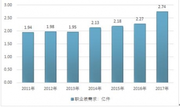 2017年我國男裝職業(yè)裝需求量約2.74億件,同比2016年的2.27億件增長了20.7%,近幾年我國男裝職業(yè)裝行業(yè)需求情況如下圖所示: