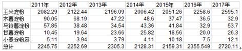 2011-2017年中國(guó)淀粉行業(yè)細(xì)分產(chǎn)量及總產(chǎn)量情況 單位:萬(wàn)噸