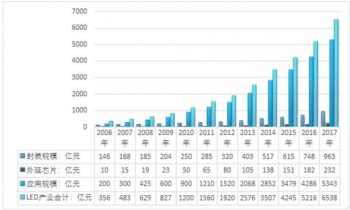 近年來,我國(guó) LED 產(chǎn)業(yè)高速發(fā)展。根據(jù)國(guó)家半導(dǎo)體照明工程研發(fā)及產(chǎn)業(yè)聯(lián)盟的統(tǒng)計(jì)數(shù)據(jù),2017年度,包括外延片及芯片制造、封裝、應(yīng)用在內(nèi)的我國(guó)LED行業(yè)總產(chǎn)值達(dá)到6538億元,同比增長(zhǎng)25.35%,相比2006年的356億元,近十一年的年均復(fù)合增長(zhǎng)率為 30.29%。