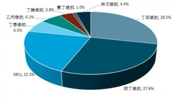 2017年新建裝置包括:煙臺(tái)浩普新材料6萬SBS裝置。改造裝置包括:華宇橡膠8萬噸/年順丁橡膠裝置改造成6萬噸/年SBS裝置。擴(kuò)建裝置包括:雙惠橡膠SBS裝置、浙江信匯丁基橡膠裝置等。2017年,丁苯橡膠、順丁橡膠和SBCs年產(chǎn)能仍排在前3位,合計(jì)占當(dāng)年國(guó)內(nèi)合成橡膠總產(chǎn)能的78.3%,較上年下降約0.1個(gè)百分點(diǎn)。