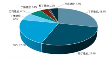 2017年新建裝置包括:煙臺浩普新材料6萬SBS裝置。改造裝置包括:華宇橡膠8萬噸/年順丁橡膠裝置改造成6萬噸/年SBS裝置。擴建裝置包括:雙惠橡膠SBS裝置、浙江信匯丁基橡膠裝置等。2017年,丁苯橡膠、順丁橡膠和SBCs年產(chǎn)能仍排在前3位,合計占當(dāng)年國內(nèi)合成橡膠總產(chǎn)能的78.3%,較上年下降約0.1個百分點。