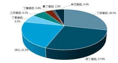 2017年新建裝置包括:煙臺(tái)浩普新材料6萬SBS裝置。改造裝置包括:華宇橡膠8萬噸/年順丁橡膠裝置改造成6萬噸/年SBS裝置。擴(kuò)建裝置包括:雙惠橡膠SBS裝置、浙江信匯丁基橡膠裝置等。2017年,丁苯橡膠、順丁橡膠和SBCs年產(chǎn)能仍排在前3位,合計(jì)占當(dāng)年國(guó)內(nèi)合成橡膠總產(chǎn)能的78.3%,較上年下降約0.1個(gè)百分點(diǎn)。