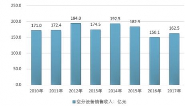 2017年我國空分設備行業市場規模約為162.5億元,同比2016年的150.1億元增加了8.26%,近幾年我國空分設備行業市場規模情況如下圖所示: