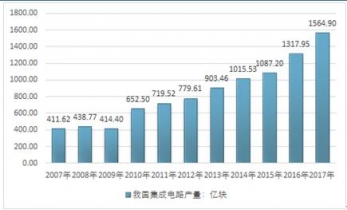 2008年以來,在全球金融危機沖擊、全球經濟不景氣等因素影響下,世界集成電路市場出現下滑。中國集成電路產業(yè)在2008年也首次出現負增長,之后在2009年繼續(xù)呈現下滑之勢,全年產業(yè)銷售額規(guī)模同比增幅由2008年的-0.4%進一步下滑至-11%,規(guī)模為1109億元。到2016年底我國集成電路年產量達到1329.20億塊,銷售收入達到4335.5億元,2017年我國集成電路產量增長至1564.90億塊。