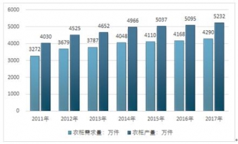 2017年我國衣柜產銷量分別達到了5232萬件,4290萬件。