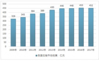 2009-2017年我國拉鏈?zhǔn)袌鲆?guī)模走勢圖