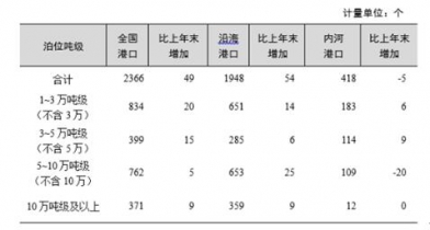 2017年末全國港口擁有萬噸級及以上泊位2366個,比上年增加49個。其中,沿海港口萬噸級及以上泊位1948個,增加54個;內(nèi)河港口萬噸級及以上泊位418個,減少5個。