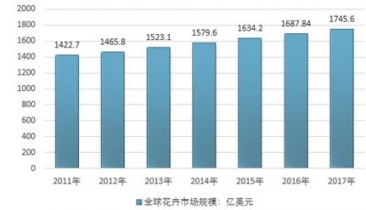 根據(jù)測(cè)算,近年來(lái)全球花卉消費(fèi)規(guī)模穩(wěn)定增長(zhǎng),從2011年的1422.7億美元增長(zhǎng)至2017年的1745.6億美元。