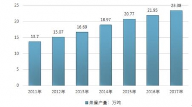 2017年我國(guó)果醬產(chǎn)量為23.38萬(wàn)噸,同比2016年21.95萬(wàn)噸增長(zhǎng)了6.51%,近幾年我國(guó)果醬行業(yè)產(chǎn)量情況如下圖所示: