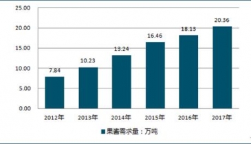近幾年以來(lái),隨著國(guó)內(nèi)經(jīng)濟(jì)的增長(zhǎng)、消費(fèi)及飲食習(xí)慣的轉(zhuǎn)變,果醬產(chǎn)品市場(chǎng)認(rèn)可度不斷抬升,消費(fèi)市場(chǎng)容量增長(zhǎng)明顯。截至2017年底,我國(guó)果醬需求量達(dá)到20.36萬(wàn)噸。