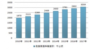 2016年我國茶園種植面積為2902千公頃,2017年為3059千公頃,同比增長5.41%。
