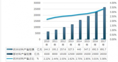 2010-2017年中國納米行業市場規模及占比新材料產值比重情況 |