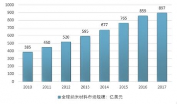 2011年全球納米材料市場產值突破450億美元,到2017年全球納米材料市場規模達到897億美元,逼近900億美元大關。2010-2017年,全球納米材料市場規模復合增長率為12.84%,雖然近兩年增速有所放緩,但是全球納米材料的發展速度依舊保持著良好的發展趨勢。