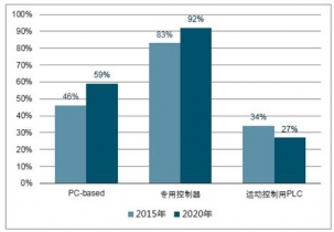 由于三類工業自動化控制均需要使用控制器,所以不是所有的控制器均用于運動控制,2015年PC-Based控制器、專用控制器、PLC用于運動控制的比重分別是46%、83%和34%。在一些行業中,專用控制器或者PC-Based正逐步替代PLC,如專用控制器在傳統切削機床、工業機器人領域發展較快,PC-Based控制器在雕刻機、半導體、物流、激光加工行業增長較快。預計到2020年,PC-Based控制器、專用控制器、PLC用于運動控制的比重分別達到59%(+13%)、92%(+9%)、27%(-7%),PC-Based控制器用于運動控制的比例顯著提升。
