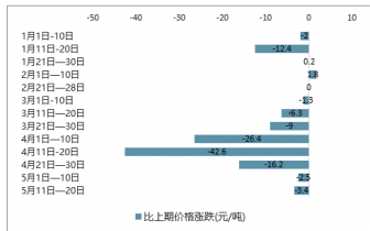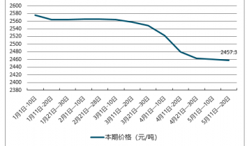 截止至2019年5月中旬,小麥(國(guó)標(biāo)三等)價(jià)格為2457.3元/噸,環(huán)比5月上旬價(jià)格下跌3.4元/噸,跌幅為0.1%;小麥(國(guó)標(biāo)三等)價(jià)格亦在此時(shí)達(dá)到目前為止最低值。1月上旬,小麥(國(guó)標(biāo)三等)市場(chǎng)價(jià)格達(dá)到最高值,為2576.1元/噸,環(huán)比2019年12月下旬價(jià)格下跌2元/噸,跌幅為0.1%。最高值與最低值相差118.8元/噸。